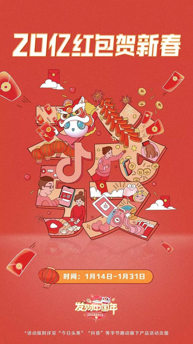 今日头条、今日头条极速版、抖音、抖音火山版、西瓜视频、 Faceu激萌、轻颜相机、皮皮虾都参与到了字节跳动系的“20亿红包贺新春”的计划中。